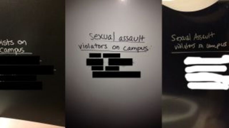 It began in Hamilton Hall, a prominent classroom building near the dorms, last Thursday. A list of four students was found in a stall with the heading "Sexual Assault Violators on Campus." According to the Columbia Lion, which broke the news, "There were four distinct styles of handwriting, which suggests multiple authors."