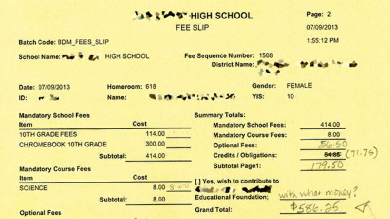 The United States ostensibly offers a free public education to every student who wants one. The reality is different. What you see above—originally published this week on Clashtalk, Gawker's community Kinja site, by an outraged parent—is part of a "fee slip" for a public high school in Park Ridge, Ill. (the full image is below). The parent in question owes $586.25 in mandatory fees for her daughter to attend tenth grade. Why?