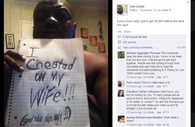 After Sonya Gore caught her husband Ivan Lewis cheating, she did what any jilted woman would do: She forced her spouse to put up a Facebook photo of himself holding a sign that reads "I cheated on my wife!!! (and she was ugly!!!)"