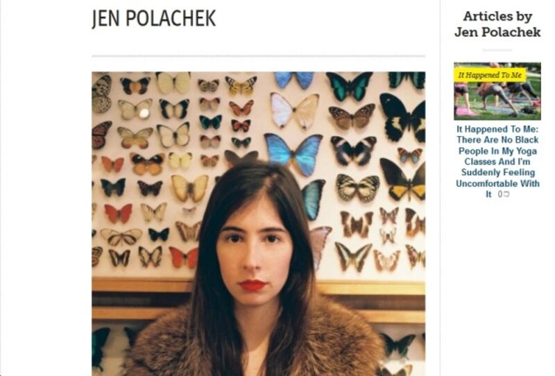 As many eagle-eyed readers noted after the essay started going around, it was originally published under the writer's actual name: Jen Polachek. (Here is a screenshot of her original XO Jane author page. Bio: "Jen Polachek was born Tokyo and has since been bouncing between the east and west coasts of America. She spends most of her time thinking about food, bodies, and how to pay her rent. She lives in Brooklyn.") Subsequently—after the deluge of negative comments—the byline on the story and on the author page was changed, with no notice, to "Jen Caron." The photo on the author page was changed to a more obscure one for a while; and then changed again, to no photo at all. Some time in the past 24 hours, Jen Polachek started deleting or locking down her internet presence. Which is understandable, given the number of negative comments she may have received.