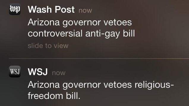 WSJ Has a Different Point of View It Would Like to Share With YouAdam Weinstein2/26/14 8:52pmFiled to: tomato/tom-ah-toarizonagay rightslgbtjournalism38619EditPromoteDismissUndismissHideShare to KinjaToggle Conversation toolsGo to permalink (via)Source tweets here and here.Reply386 repliesLeave a reply