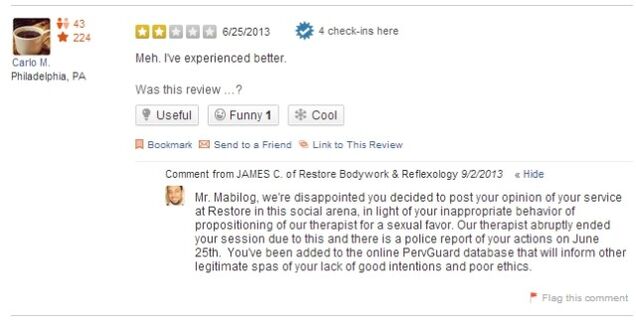 A disappointed customer who decided to inform the world of his negative experience at a Philadelphia health spa took his review to Yelp, where he gave the business two stars and a "meh."