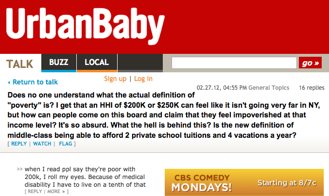 Your UrbanBaby.com thread of the day: "Got invited to applebees by friend. (she's [middle class]) what do you order there?" Suggestions include "maybe a side salad with no dressing," "Iced tea, then eat at home," and "Is there a Le Pain Quotidien nearby?"